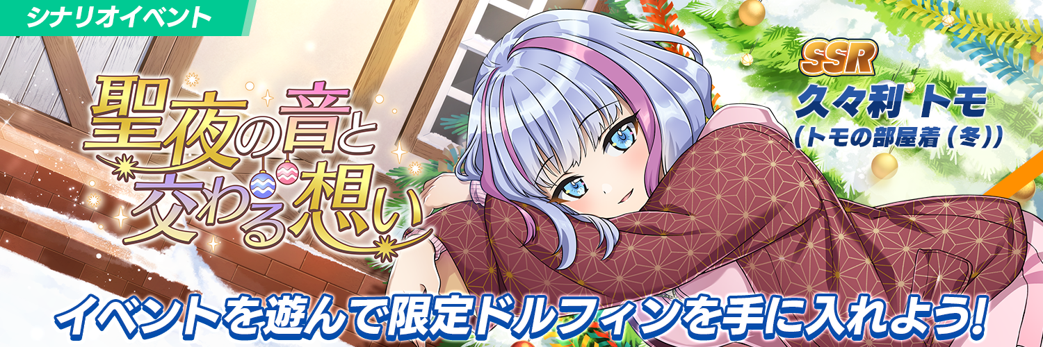 アイテムを集めて、イベント限定ドルフィン「久々利 トモ(トモの部屋着(冬))」やドルフィン育成素材、ポーズ等、様々なアイテムを手に入れよう。