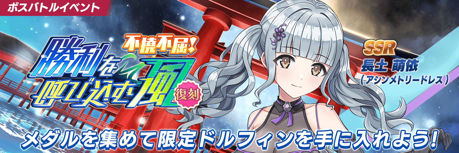 期間限定ショップ「ボスメダル(不撓不屈)」にて、イベント限定SSRドルフィン「長土 萌依(アシンメトリードレス)」を入手することができます。